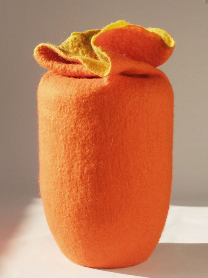 Dreifarbige Urne aus Filz, Material Australische Merinowolle. Höhe ca. 33 cm